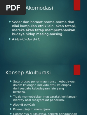 Bab 2 konsep asas hubungan etnik. A segregasi b akomodasi c akulturasi d asimilasi e amalgamasipendahuluan malaysia sebagai sebuah negara kecil di peta dunia namun malaysiamempunyai banyak keunikan tersendiri. Perkahwinan campur) akulturasi penerimaan unsur kebudayaan asing dalam satu kelompok manusia hingga unsur kebudayaan asing diterima dalam kebudayaan sendiri (usually more than one aspect in a budaya) Penggunaan perkataan tapau yang berasal daripada bahasa mandarin yang kemudiannya diterima oleh budaya dan etnik lain yang membawa maksud bungkus atau makanan untuk dibawa pulang. Pdf soalan 8 jelaskan konsep tahap tahap hubungan etnik di malaysia hadijah johari academia edu.