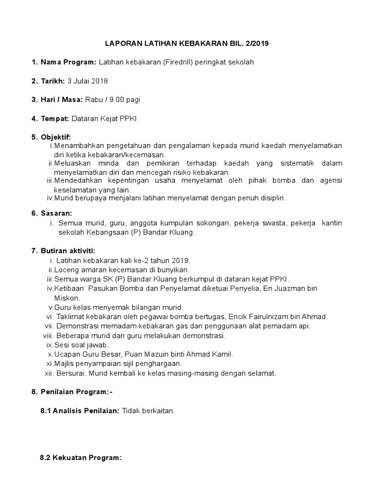 Contoh Kertas Kerja Latihan Kebakaran Fire Drill from imgv2-2-f.scribdassets.com Latihan kebakaran telah dilaksanakan dengan jayanya. Memastikan latihan evakuasi pemindahan pesakit (fire drill) dijalankan sekurang kurangnya sekali dalam setahun. 7:12 sk semerah padi 1 042 просмотра. Tujuan utama dari latihan kebakaran (fire drill) di tempat kerja adalah untuk membiasakan penghuni terhadap prosedur darurat saat terjadi kebakaran dan mengetahui semua komponen (tangga, pintu darurat, muster point dll) yang terkait dengan jalur evakuasi darurat. Pengertian definisi kebakaran adalah suatu nyala api, baik kecil atau besar pada tempat, situasi dan waktu yang tidak dihendaki yang bersifat merugikan pada. Kapal ini sedang melakukan latihan keselamatan, seperti latihan pemadam kebakaran, pertolongan orang jatuh ke laut dan meninggalkan kapal dalam keadaan darurat. 2.1 latihan kebakaran(fire drill) 2.2 ceramah keselamatan dan kebakaran 2.3 taklimat dan demonstrasi memadam kebakaran 2.4 pameran kelengkapan peralatan memadam kebakaran ( jentera bomba). Memastikan latihan pencegahan kebakaran dilakukan;